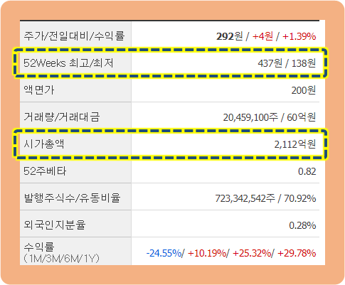 52주 동안의 시세의 변화를 보면 최저점 138원, 최고점 437원으로 약 3배 차이입니다.