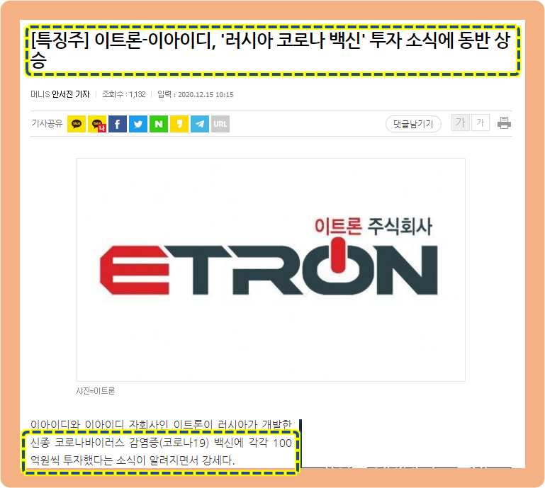 또한 지난해 12월에 이아이디는 자회사로 있는 이트론사와 함께 러시아 코로나 백신에 각각 100억 원을 투자했다는 소식이 발표되었습니다.