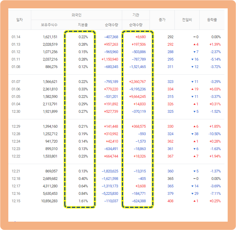 외국인과 기관에게 인기가 많은 종목은 아닌 것으로 보입니다.