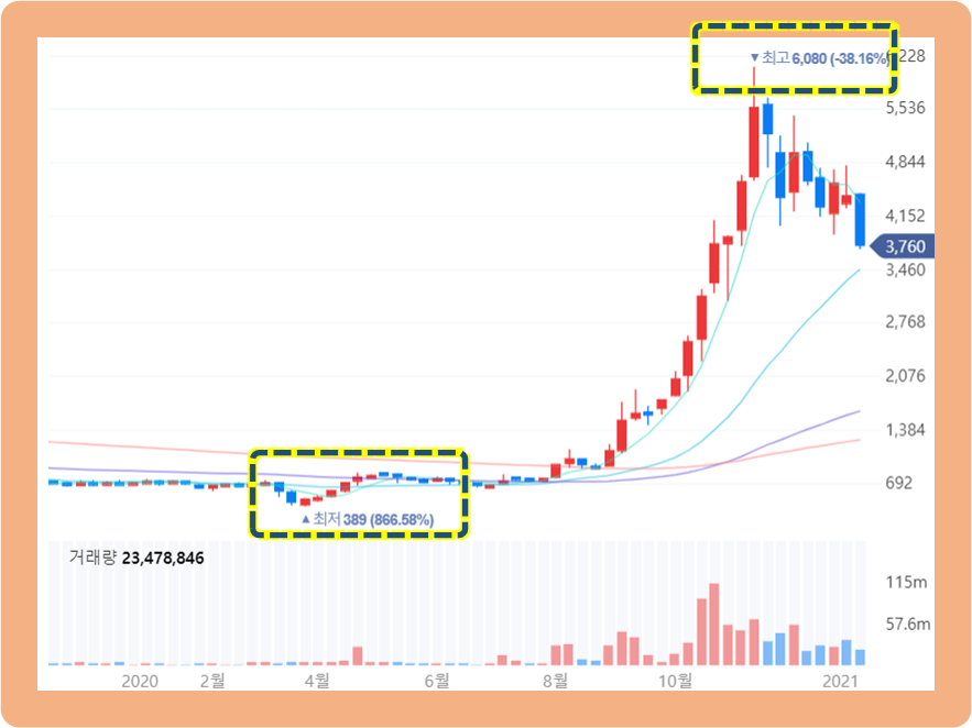 이후 주가는 즉시 제자리를 되찾았고, 20년도 8월에 상승하기 시작하더니, 20년 11월 20일에 15배가 넘는 6,080원까지 올랐습니다.